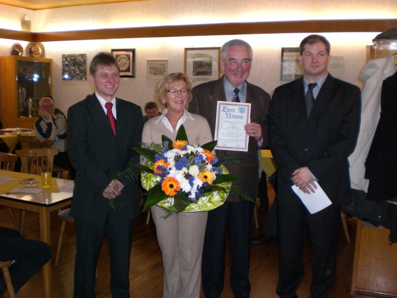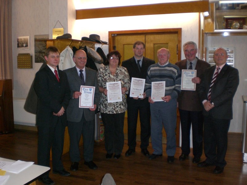 Der Ältestenrat mit Anton Kloos, Hans Merz und Gerd Metzenroth wurde für die nächsten 3 Jahre bestätigt. Als Kassenprüfer fungieren Rüdiger Stelzel und Ivonne Mohr. Im Rahmen der Ehrungen wurde seitens der TSG Kempten Harald Schweickardt für 50-jährige Mitgliedschaft mit der Ehrennadel in Gold geehrt. Die weiteren Vereinsjubilare wurden bereits im Rahmen der Weihnachtsfeier gewürdigt. Toni Gumbrich, der zuvor bei den Neuwahlen auch die Versammlungsleitung übernahm, konnte in seiner Funktion als 1. Vorsitzender des Turngau Bingen 3 Übungsleiter auszeichnen. Seit 10 Jahren leitet Anton Kloos die Gruppe Seniorensport und wurde dafür mit der ÜL-Ehrennadel in Silber, Ulrike Heid für bereits 17-jährige Tätigkeit als Übungsleiter mit der ÜL-Ehrennadel in Gold geehrt. Für insgesamt über 19-jährige Tätigkeit zunächst als Übungsleiter, Beisitzer Turnen, Abteilungsleiter Turnen und 2. Vorsitzender konnte der neue 1. Vorsitzende Michael Syre die Ehrennadel des Turngau Bingen in Gold entgegennehmen. Zwei besondere Ehrungen erhielt der ausgeschiedene Vorsitzende Claus Pickel. Seitens des Deutschen Turnerbundes erhielt der für seine Leistungen im Rahmen seiner nunmehr abgelaufenen Vorstandsarbeit die höchste Auszeichnung des DTB in Form der Ehrennadel in Gold. In einer Laudatio würdigten die beiden neuen Vorsitzenden Michael Syre und Michael Kloos die zahlreichen Verdienste von Claus Pickel. Im Jahr 1977 in den Verein eingetreten, wurde er bereits 1978 als Beisitzer in den Vorstand gewählt und war bei der 100-Jahr-Feier des Vereins im Jahr 1979 maßgeblich beteiligt. Am 10. 01. 1982 wurde Claus Pickel zum 1. Vorsitzenden gewählt. Nach 26 Jahren in dieser Funktion und insgesamt 31 Jahren Vorstandarbeit hat er als 8. Vorsitzender der TSG Kempten ein Fünftel der dann 129-jährigen Vereinsgeschichte ganz entscheidend mitgeprägt. Neben Großen Feierlichkeiten und Jubiläen wie der 110. Geburtstag der TSG in 1989, das 25-jährige bestehen des Sportheims, dessen Ausschuss er seit 1982 angehörte, der 75-Jahr-Feier der Handballabteilung in 1997 und letztendlich dem 125-jährigen Jubiläum des Vereins in 2004 wurden unter seiner Regie zahlreiche sportliche Großereignisse im Turn- und Handballbereich durchgeführt oder Sportverbände bei solchen unterstützt. Hinzu kamen wegweisende Entscheidungen. Die von ihm mit initiierte Radwanderabteilung wurde 1995, 1997 der Freundes- und Förderverein der TSG Bingen-Kempten und 1999 die HSG Rhein-Nahe-Bingen gegründet. Konsequenterweise hat daher der Gesamtvorstand beschlossen Claus Pickel hierfür zum Ehrenpräsidenten der TSG zu ernennen.