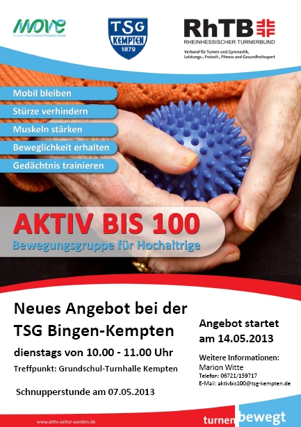 Unter dem Titel „Aktiv bis 100“ startet die TSG Kempten im Rahmen des Pilotprojektes des Rheinhessischen Turnerbundes eine Bewegungsgruppe „Aktiv bis 100“ sowie eine „Spaziergehgruppe“ als neue Kursangebote an.