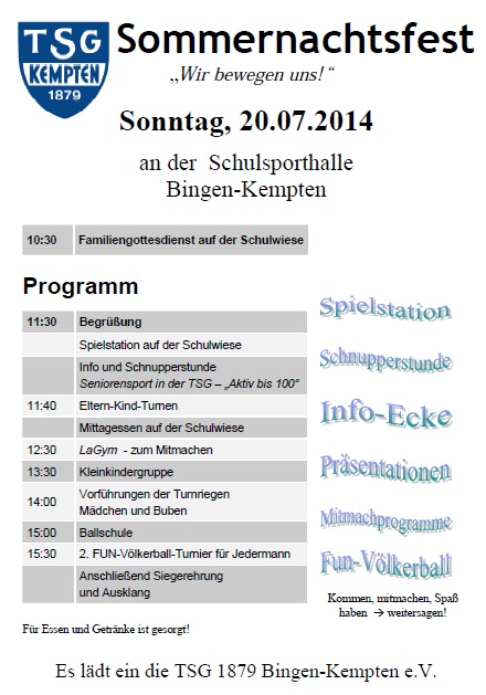 die TSG 1879 Bingen-Kempten e.V. lädt Sie recht herzlich zu unserem diesjährigen Sommernachtsfest auf der Schulwiese am Sonntag den 20. Juli 2014 ein. Das Fest steht wieder unter dem Motto: „Wir bewegen uns!“ Wie vielfältig unser Bewegungsangebot ist, möchten wir Ihnen mit unseren Präsentationen aus den einzelnen Übungsgruppen der Turnabteilung zeigen. Neben den Präsentationen haben wir Ihnen von der Spielstation, über die Mitmachangebote bis hin zu einem FUN-Völkerball-Turnier ein vielfältiges Angebot zusammengestellt. Es würde uns freuen, Sie auf unserem Fest begrüßen zu dürfen.